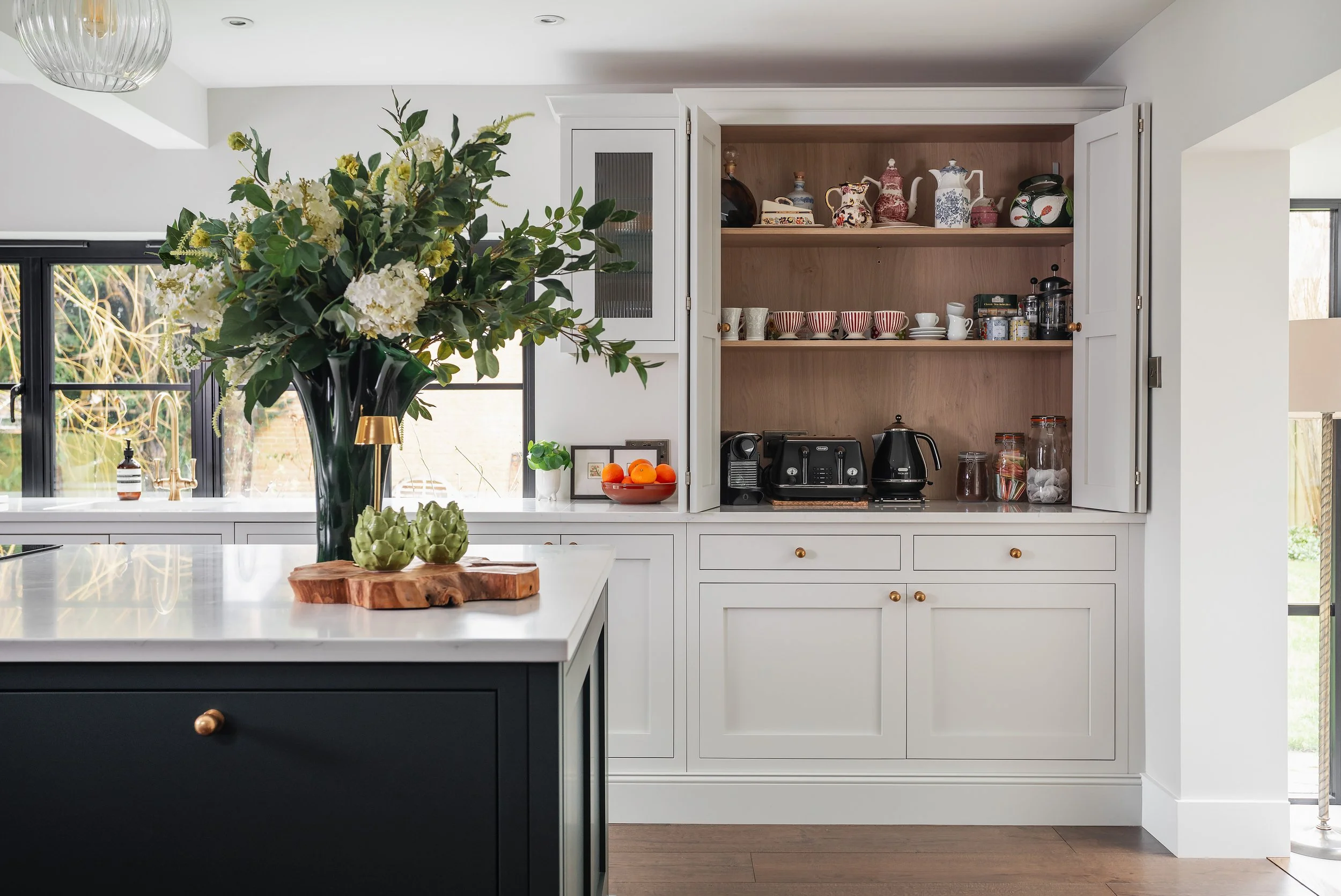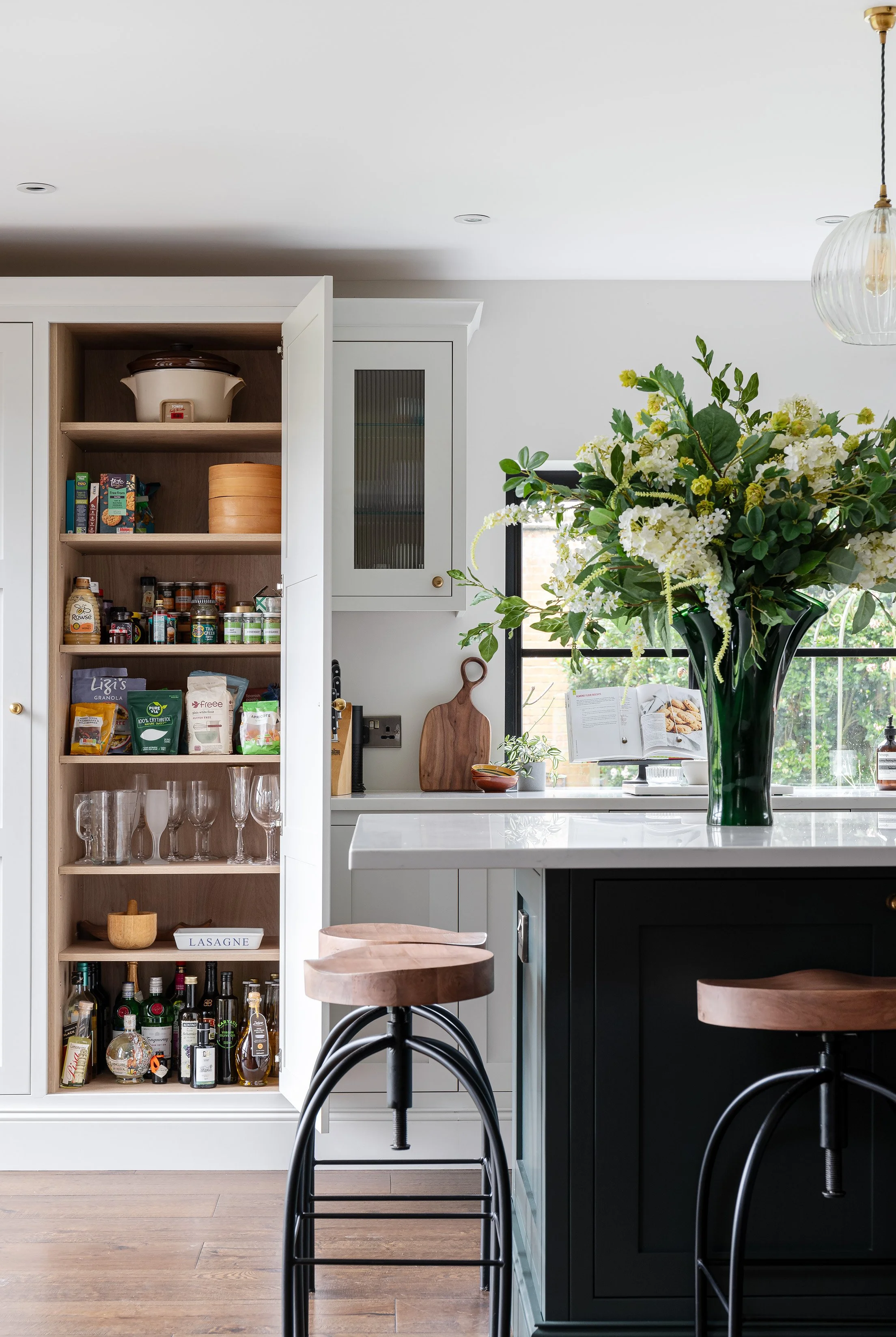 It was important for us to line up the mid-rails on the tall fridge and larder doors, as well as the breakfast pantry bifold doors with the frames on the glass wall cabinets so everything is harmoniously in-line across the main run - a detail that is often overlooked in kitchen design but just one of the many small finer details we work hard on behind the scenes to achieve perfection.