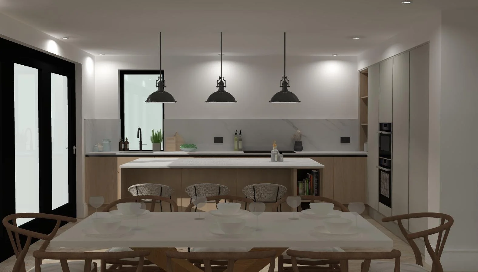 The result is a clean, modern scandi-style kitchen that balances natural materials with crisp, contemporary lines. The oak doors add a tactile, organic feel that anchors the space, while the handleless cabinetry design keeps things sleek and understated. We paid close attention to proportions and symmetry, as seen in the generous island with its integrated open shelving — perfect for cookbooks or display items. The trio of pendant lights above provides warm task lighting and a sense of balance, drawing the eye into the heart of the room.