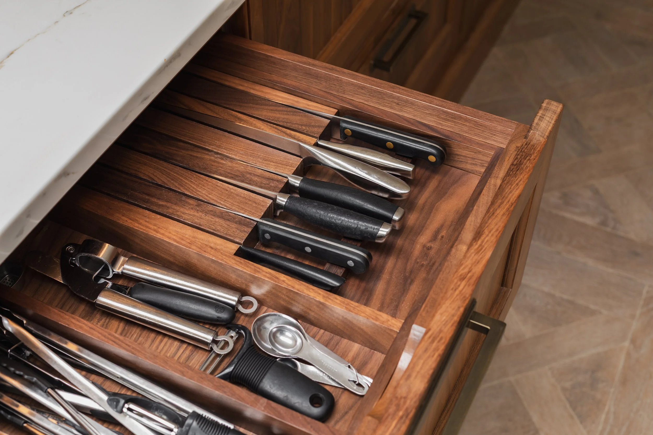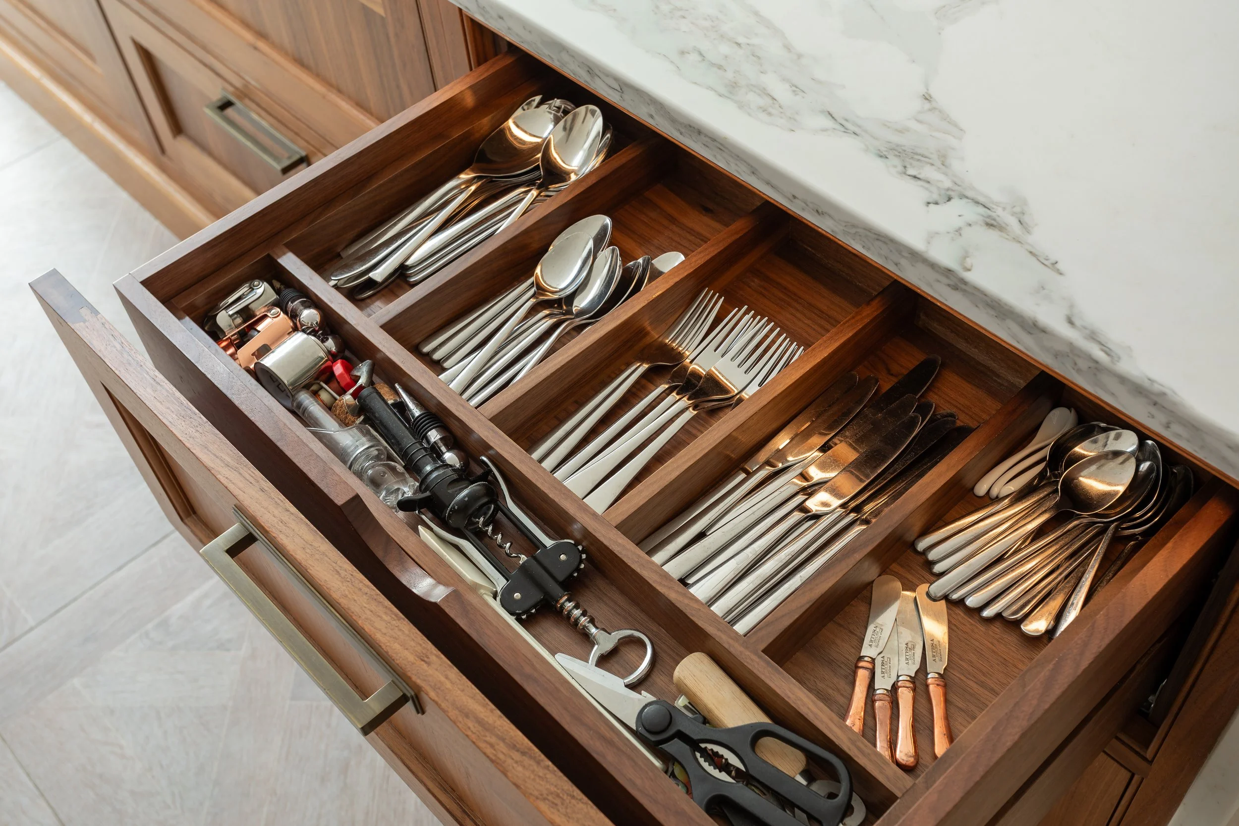 Handcrafted walnut drawers feature throughout the kitchen, complete with custom cutlery organisers, knife block and spice racks. A standout feature is the bespoke larder, incorporating door-activated lighting, internal walnut drawers and beautifully organised shelving, combining practicality with a truly luxurious feel.