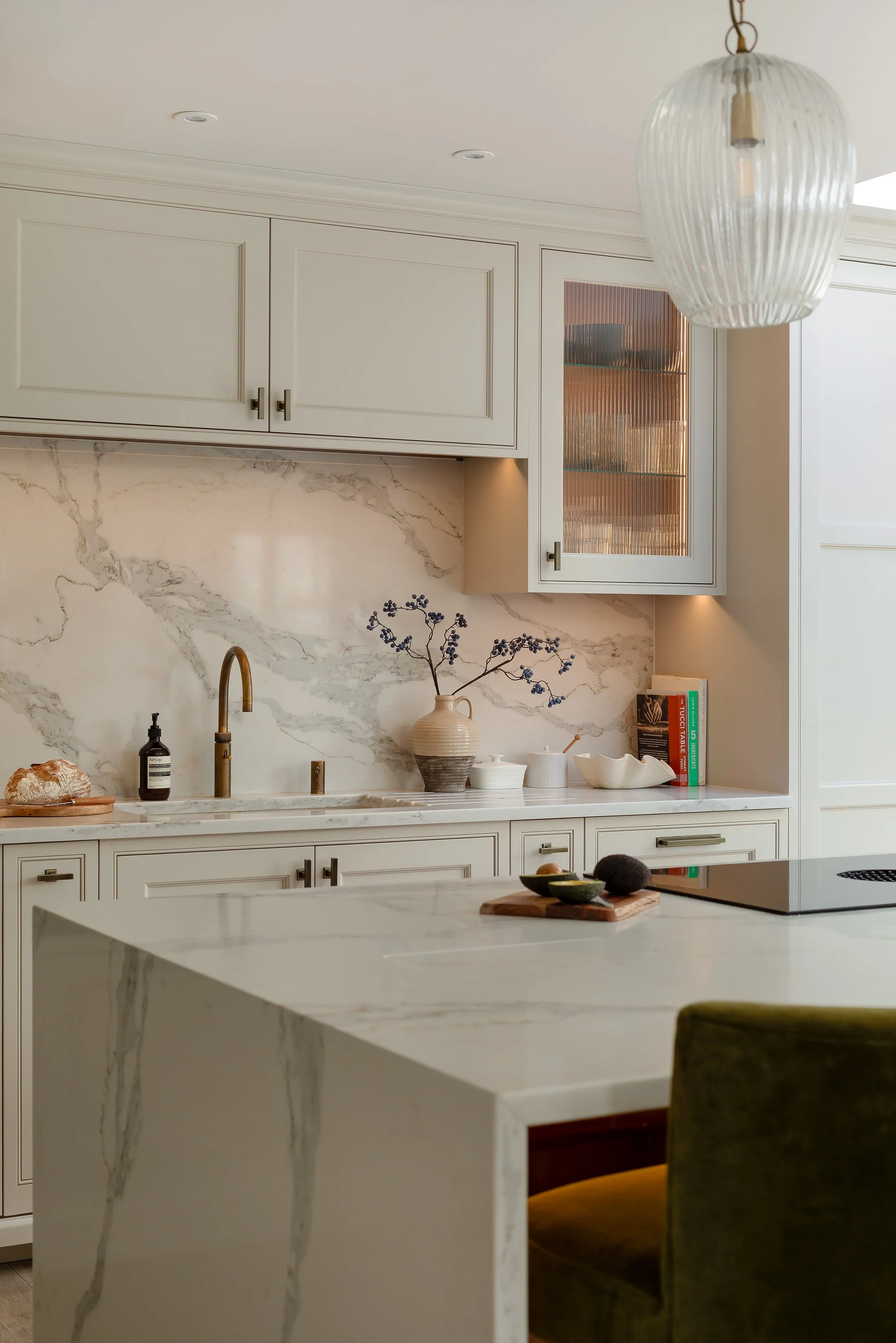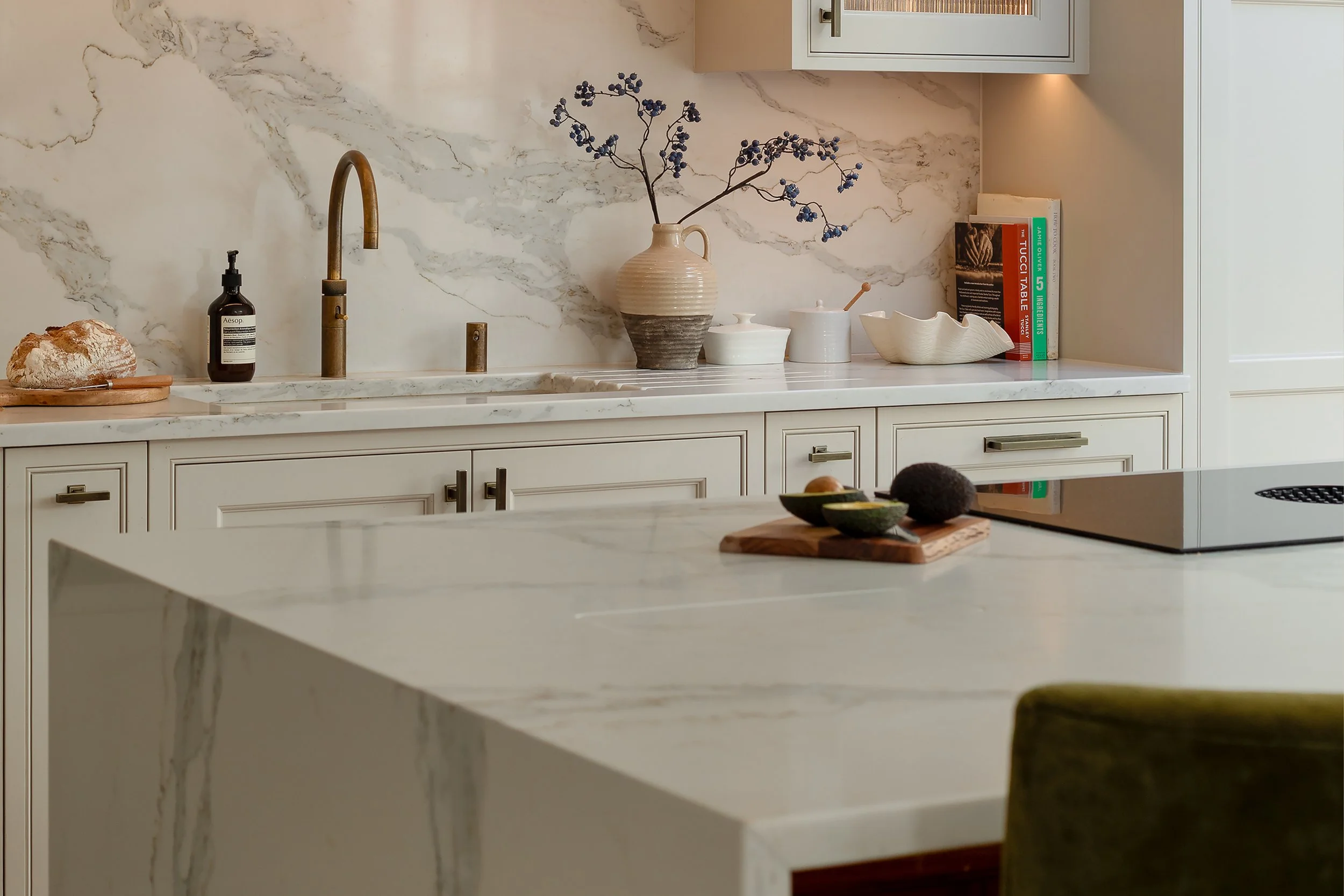 We chose Classic Quartz Montclair quartz worktops, for their elegant veining and luxurious appearance. These flow seamlessly into a full height quartz splashback, bringing cohesion and drama to the cooking area. The island features a double mitred waterfall edge, adding a bold visual impact.