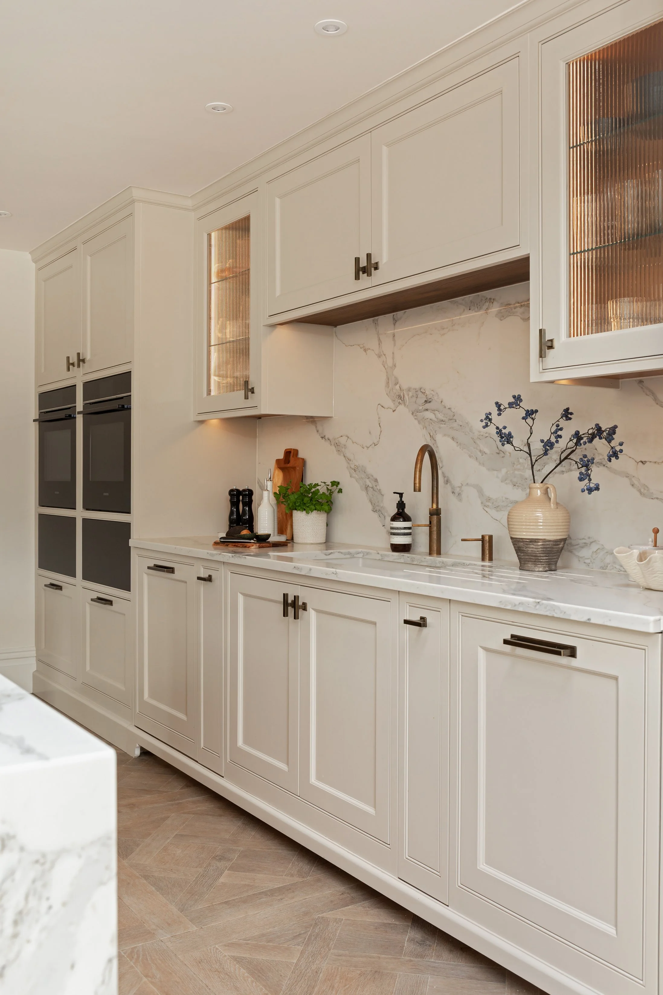 Refined details elevate the overall design, including two illuminated reeded glass wall cabinets that add texture and visual interest while softly showcasing glassware.