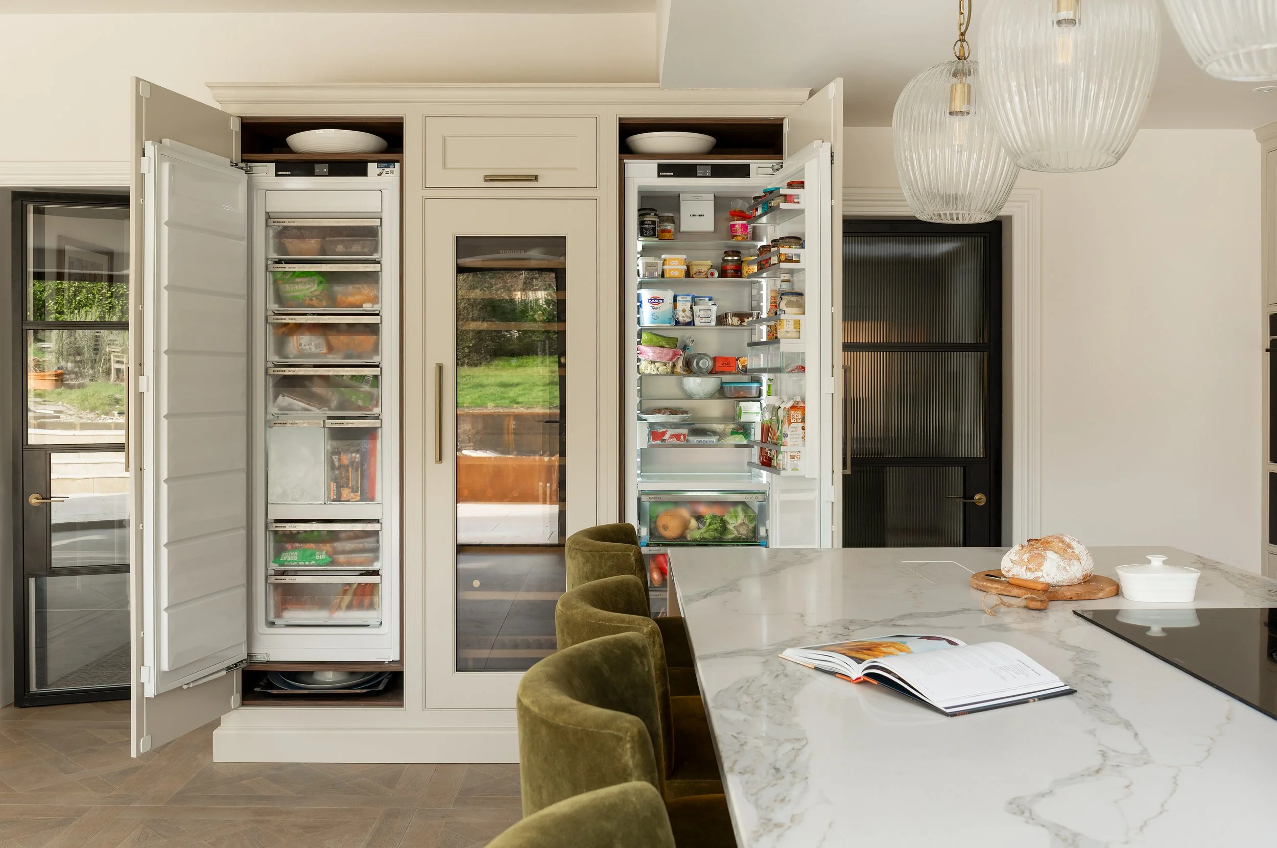 The full height fridge, separate freezer, and additional glass-fronted wine cooler were all intregrated beautifully into our cabinetry for a clean, seamless look.