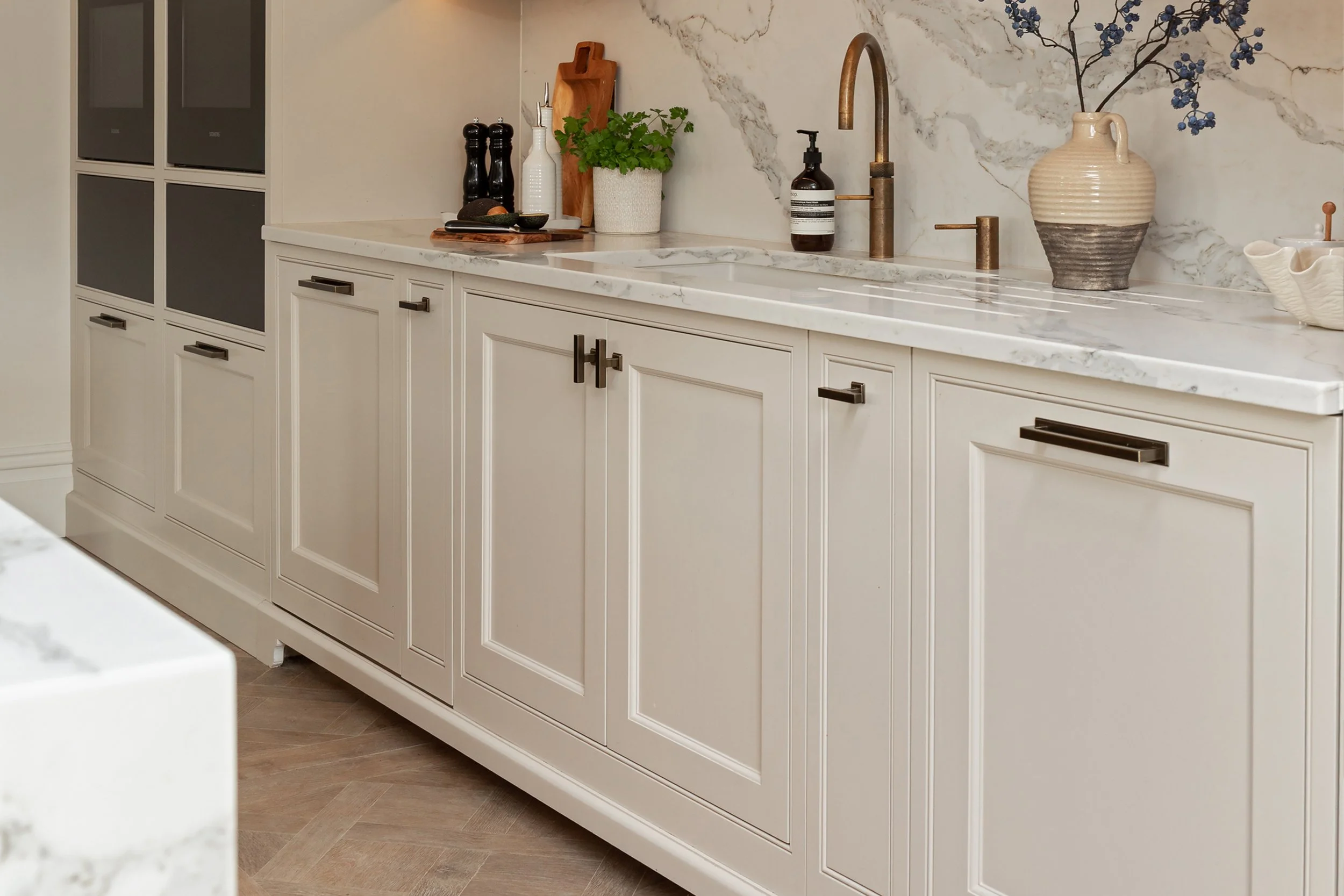 Hardware was carefully selected, with Hendel & Hendel Liberty handles with backplates and T-bars in dark brushed brass bringing a subtle richness to the cabinetry. A Quooker Fusion tap in patinated brass with matching soap dispenser complements the warm tones, while a BORA X Pure vented hob provides sleek, integrated ventilation on the island. Discreet power is supplied via an S-Box Chameleon pop-up socket, maintaining the clean lines of the island.